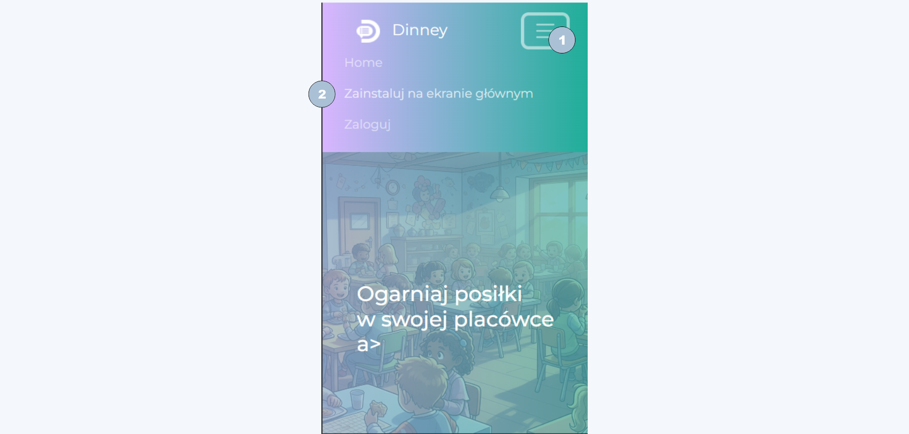 Dla większej wygody możliwe jest dodanie aplikacji do ekranu głównego telefonu lub tabletu. Aby to zrobić, należy kliknąć w menu rozwijalne (1) a następnie „Zainstaluj na ekranie głównym” (2).