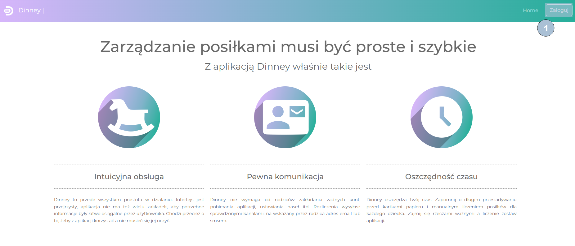 Wejdź na stronę app.dinney.pl aby otworzyć stronę główną aplikacji. Następnie kliknij przycisk „Zaloguj” (1), aby otworzyć okienko logowania/rejestracji. Następnie u dołu okna kliknij „Zarejestruj się” (2)