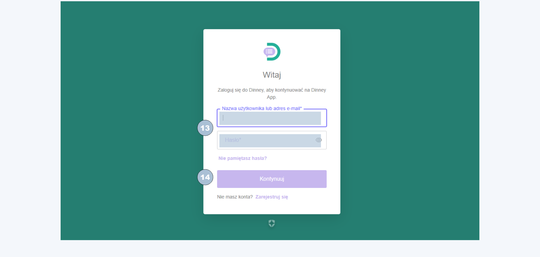 Wejdź na stronę app.dinney.pl aby otworzyć stronę główną aplikacji. Następnie kliknij przycisk „Zaloguj” (13), aby otworzyć okienko logowania/rejestracji. Następnie uzupełnij nazwę użytkownika lub adres email oraz podaj hasło. Na końcu kliknij przycisk „Kontynuuj” (14). Po zalogowaniu u góry ekranu zobaczysz wszystkie funkcjonalności (12). Uwaga – w przypadku Dostawców widoczne będą tylko następujące odnośniki: Home, Menu (w nim rozwijalne Menu tygodniowe oraz Wzorce) oraz Konto użytkownika.