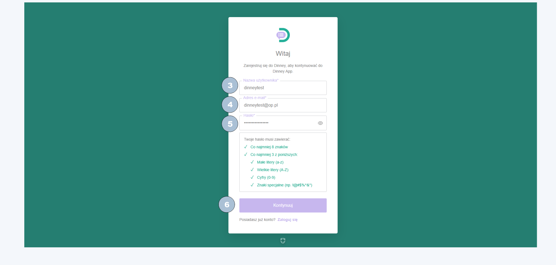 Uzupełnij nazwę użytkownika (3), adres email (4) oraz hasło (5). Pamiętaj, aby nazwa użytkownika nie zawierała polskich znaków, spacji ani znaków specjalnych. Z kolei hasło musi mieć co najmniej 8 znaków, w tym co najmniej trzy spośród: małych liter, wielkich liter, cyfr i znaków specjalnych. Następnie kliknij przycisk „Kontynuuj” (6).