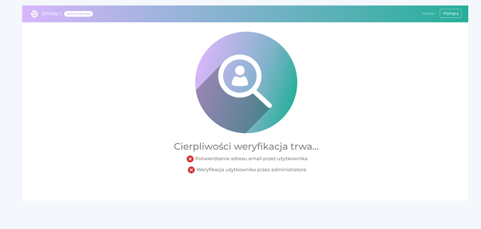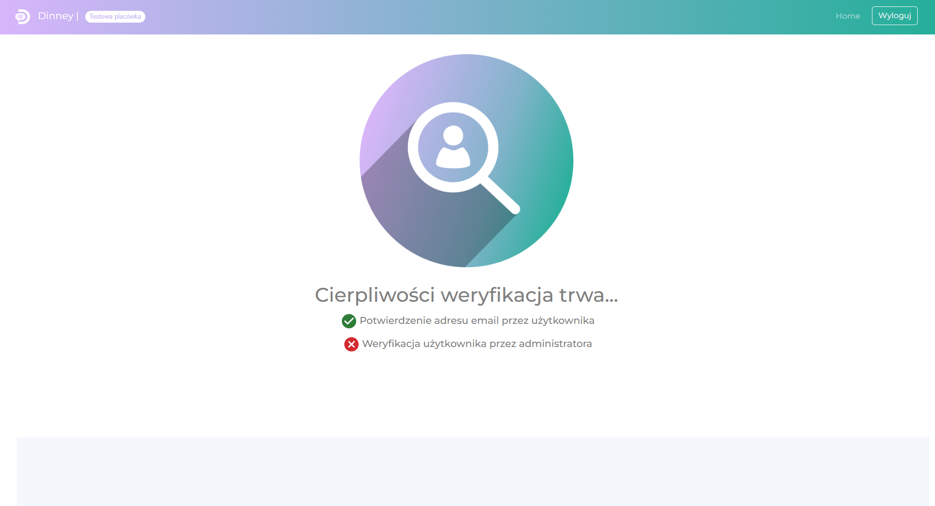 W ostatnim kroku potwierdź rejestrację Twojego konta i powiązanie go z aplikacją Dinney (10). Na tej podstawie zostanie wysłany email z linkiem weryfikacyjnym, system zaś przeniesie Cię na stronę główną dla niezweryfikowanych użytkowników. Na tej stronie zobaczysz status swojej rejestracji: