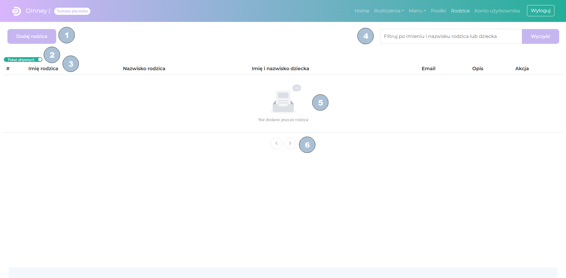 Zakładka „Rodzice” to jedna z dwóch podstawowych funkcjonalności Dinney. Wprowadzasz w niej rodziców, którzy uczęszczają do Twojej placówki i których będziesz rozliczać z posiłków.