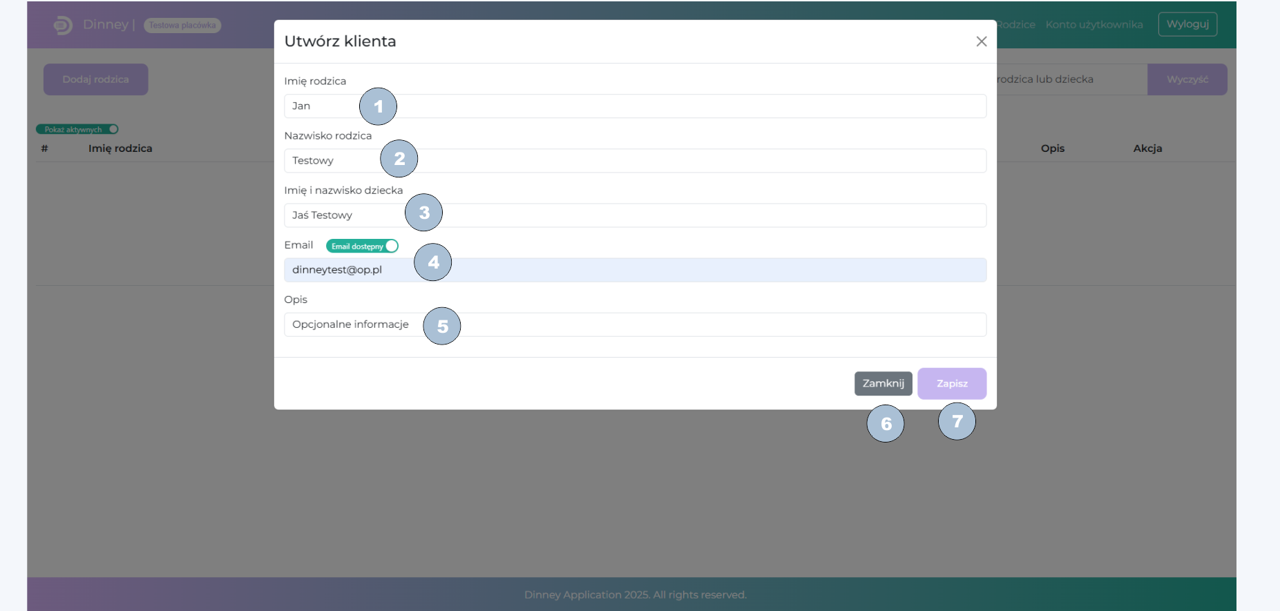 4 – Email rodzica. Pole musi wypełnione poprawnym adresem mailowym. Pole jest obowiązkowe lub może być oznaczone jako niedostępny – wówczas dany rodzic nie będzie mieć przypisanego maila i w związku z czym nie będzie możliwości wysyłania mu rozliczeń. Limit znaków to 150.