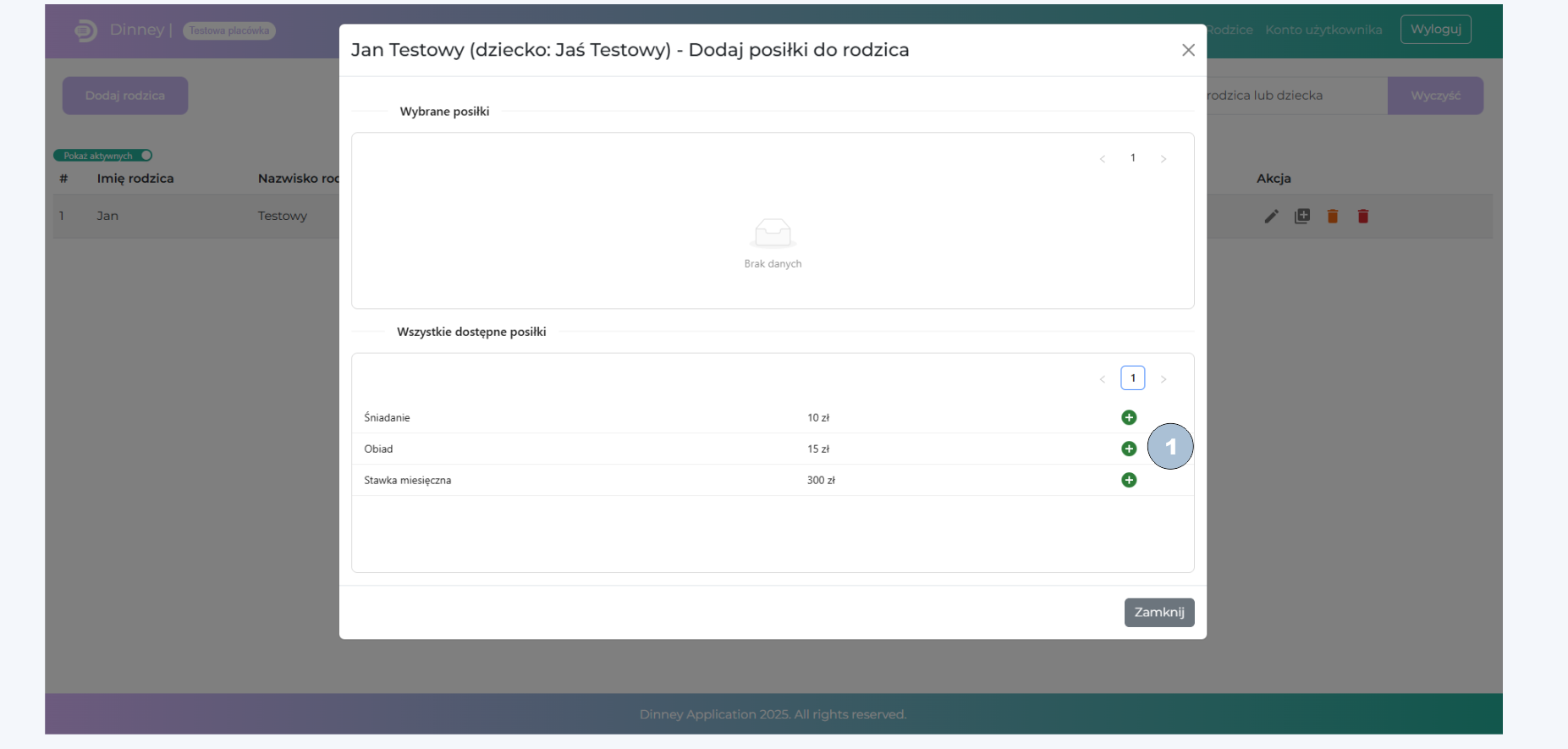 Po kliknięciu powiązania posiłków z rodzicem otworzy się nowe okno. w nim będziesz mieć możliwość powiązania wcześniej dodanych posiłków do danego rodzica. Robisz to po to, aby w zakładce „Rozliczenia” było możliwe naliczanie danego posiłku dla konkretnego rodzica.