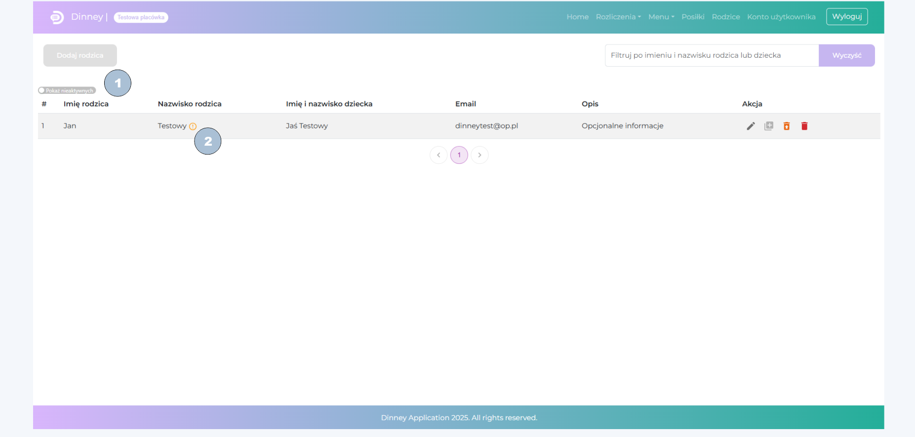 Podobna zasada obowiązuje w przypadku usuwania samego rodzica. Klikając pomarańczowy kosz ustawiasz datę zakończenia aktywności rodzica na ostatni dzień bieżącego miesiąca. W tym przypadku rodzic znika z listy aktywnych i za pomocą przełącznika (1), trzeba zmienić widok listy, aby go zobaczyć. Będzie on również miał adnotację (2), że będzie widoczny do końca bieżącego miesiąca i podobnie jak poprzednio, można uczynić rodzica aktywnym poprzez kliknięcie pomarańczowego kosza ze strzałką. Ale uwaga! Usunięcie rodzica również usuwa powiązanie z posiłkiem! Oznacza to, że po przywróceniu rodzica należy ponownie edytować powiązanie posiłków z rodzicem i przywrócić je.
