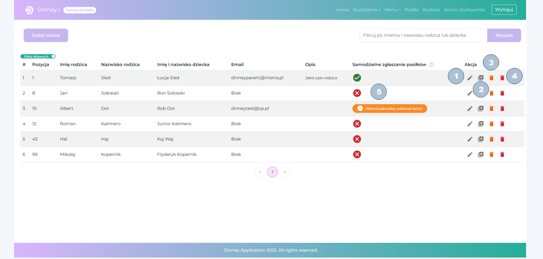 W Dinney możesz samodzielnie utworzyć rodzicowi konto, na które będzie się logować i zgłaszać/odwoływać posiłki. Kolumna „Samodzielne zgłaszanie posiłków” wskazuje jaki jest status danego rodzica: